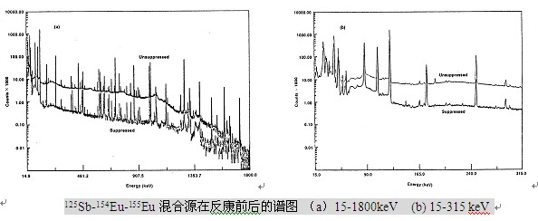 當(dāng)被測(cè)樣品放出的γ射線(xiàn)入射到主探測(cè)器,其中發(fā)生康普頓效應(yīng)的光子將產(chǎn)生非全能峰信號(hào);散射光子同時(shí)進(jìn)入到反符合屏蔽探測(cè)器產(chǎn)生信號(hào),反符合電子學(xué)線(xiàn)路就會(huì)使這些信號(hào)不被譜儀記錄,從而起到降低系統(tǒng)本底、提高峰康比的作用。